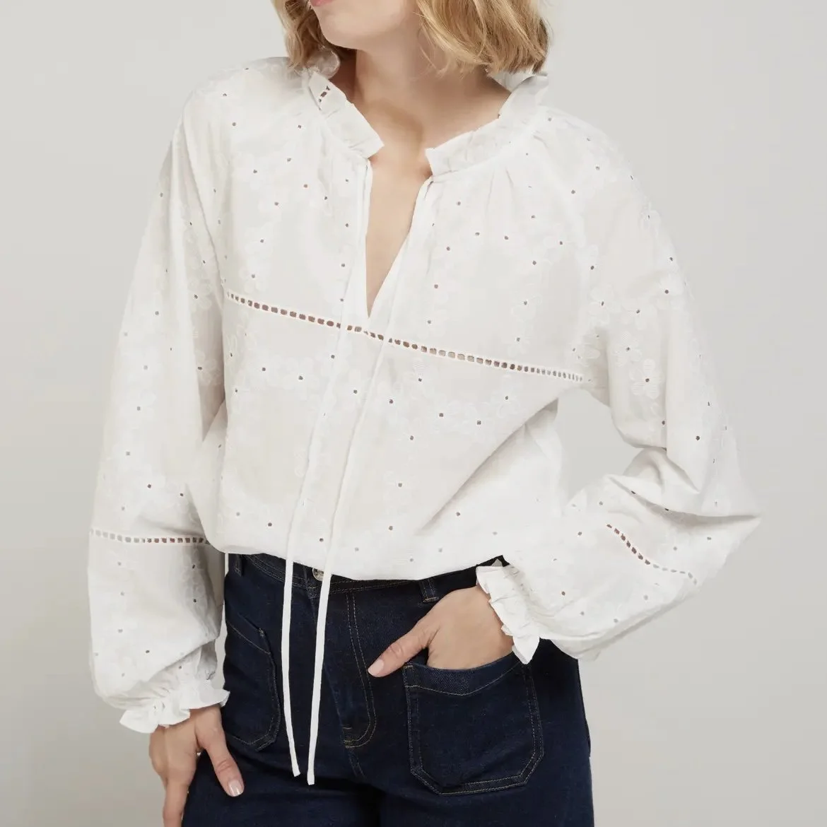 The Boho blouse embodies the very essence of refined "hippie-chic" style. It's the famous little white blouse that you must have in your wardrobe, revisited with delicate details for a feminine and airy look. 100% Cotton. A light, breathable, and soft fabric on the skin, perfect for sunny days. A stunning plunging V-neck highlighted by fine lace inlays, crafted sleeves, and a fluid cut. White. An immaculate and bright shade that enhances a tan and matches everything. Wear it with frayed denim shorts for a festival look or tucked into a long floral skirt for a romantic look.