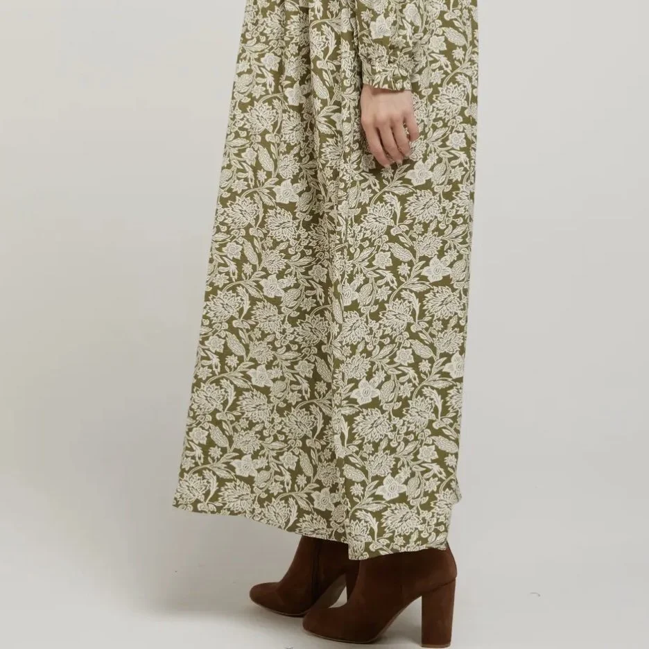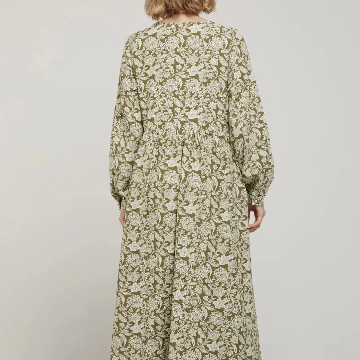 The waist is gently defined with subtle gathers that create a fluid, flattering shape, while the long sleeves with elasticated cuffs add relaxed sophistication. Falling to ankle length, the dress moves beautifully and can be styled casually with sandals or elevated with boots and a belt.