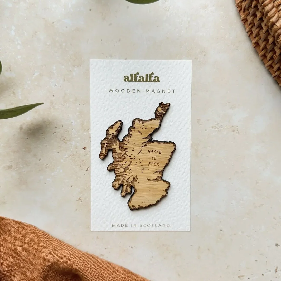 This map of Scotland magnet features the beautiful land of Scotland and the engraved sections are the larger lochs and surrounding water, with "haste ye back" engraved to remind you to return back.