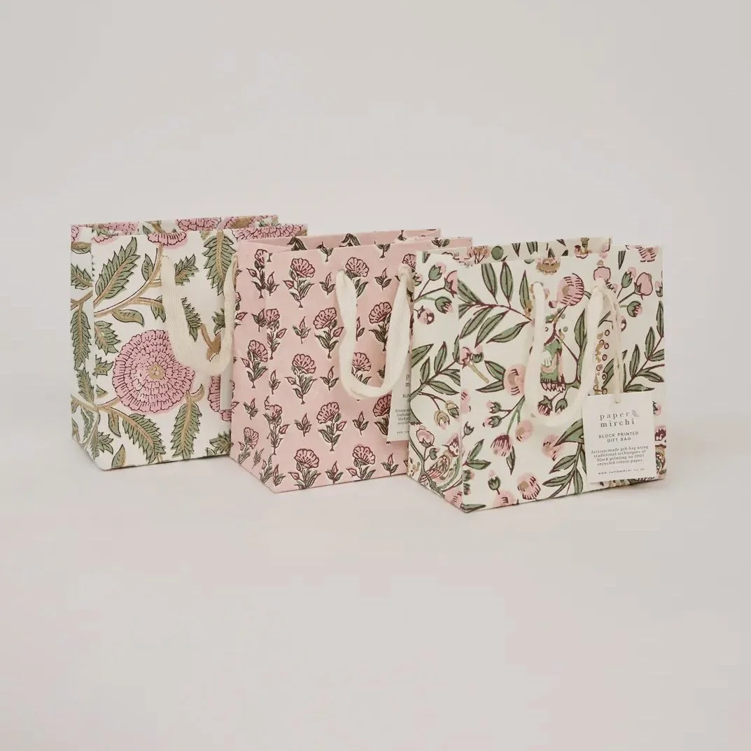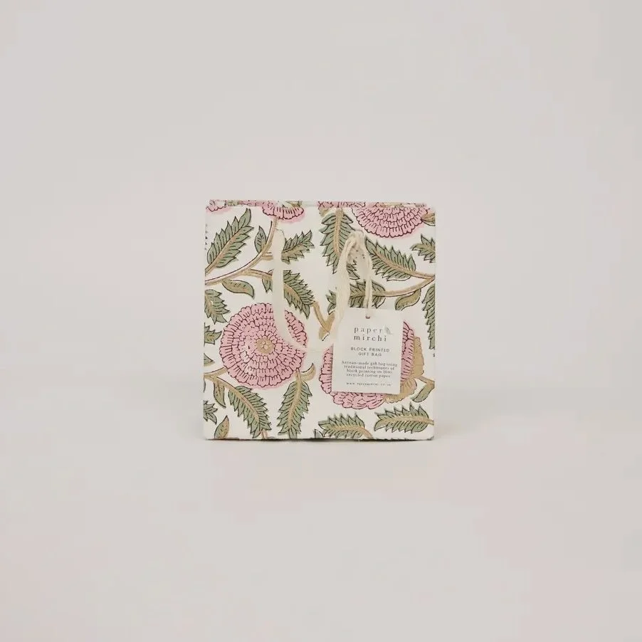 Our unique collection of hand block printed gift bags bring together craftsmanship and colour in the most beautiful way. Each one is made from strong 250gsm recycled cotton card paper in colours and designs complementing the gift wrap range.