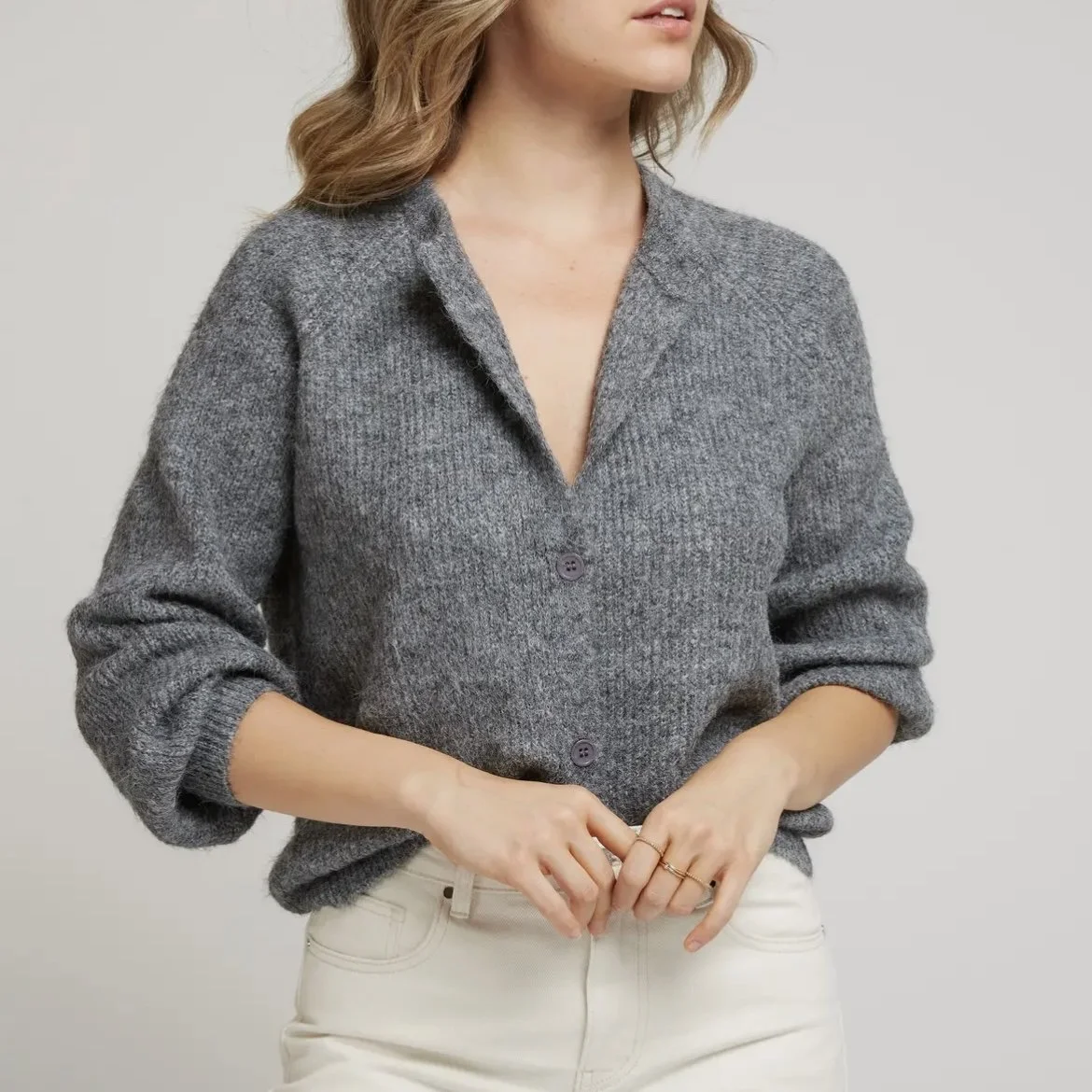 This soft knit cardigan charms with its straight cut and colourful retro plastic buttons. The ribbed finishes at the collar, cuffs, and hem add texture. Can be worn open or closed according to your preference.